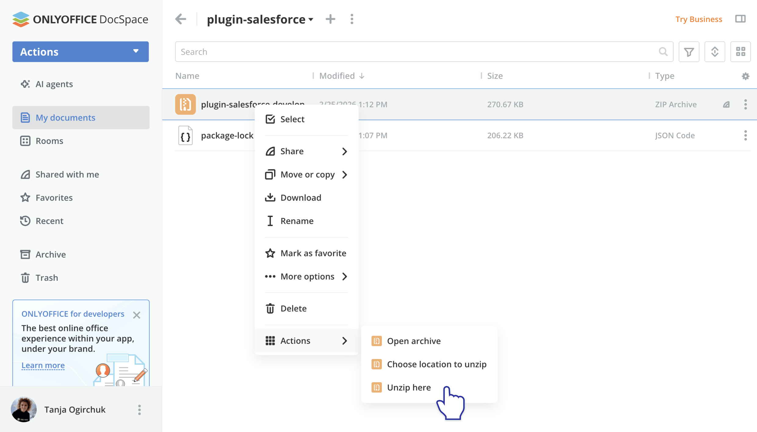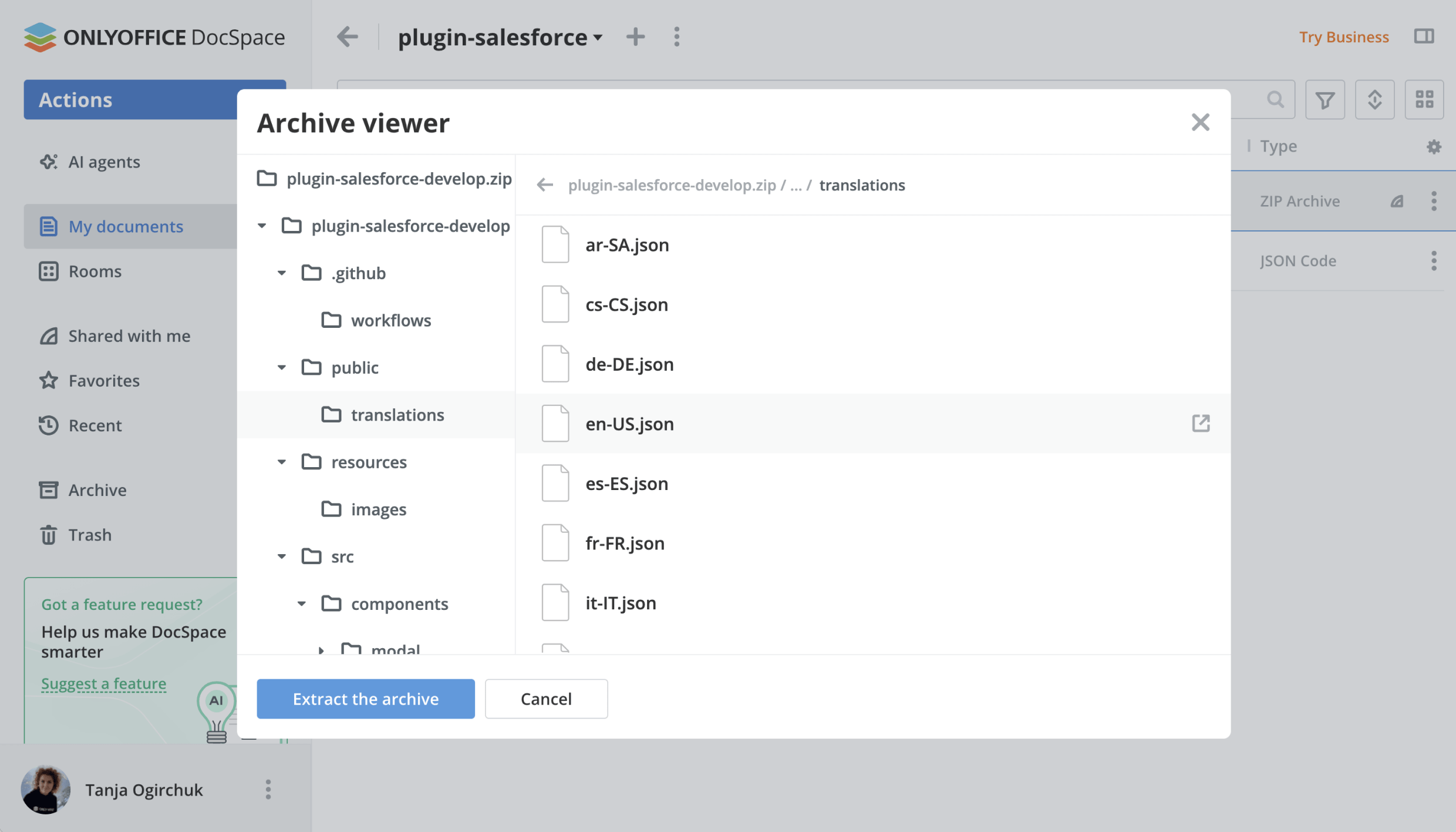 The ZipArchives plugin makes it possible to preview and extract ZIP archives directly in ONLYOFFICE DocSpace. It helps teams work with compressed files without downloading external tools or unpacking archives locally.